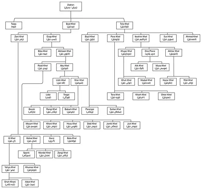 The Zadran (Pashto: ځدراڼ dzadrāṇ; pronounced dzādroṇ in the Khost-Paktia dialect), also spelled Dzadran or Jadran, is a Pashtun tribe that inhabits the Loya Paktia region in southeastern Afghanistan (Khost, Paktia, and Paktika provinces) and parts of Waziristan in neighboring Pakistan. "Zadran: Pashtun tribe mainly residing in the “Zadran Arc” a 9-district area encompassing portions of the Khost, Paktya, and Paktika provinces."[1][2][3][4]