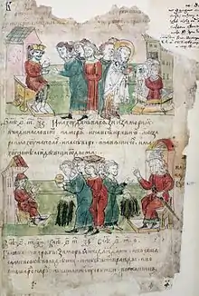![]() Bulgarians make a request to Byzantine Emperor Michael to baptize them; christening of Bulgarians. Miniature from Radzivill Chronicle.