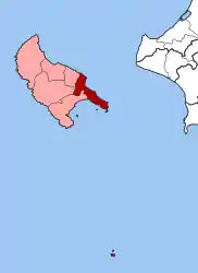 The municipal unit of Zákynthos lies in the easternmost part of the island and has a land area of 45.79 square kilometres (17.68 square miles)[3] and a population of 16,810 at the 2011 census. It is subdivided into the communities Zakynthos (pop. 9,773), Ampelokipoi (1,930), Argasi (1,266), Vasilikos (799), Gaitani (1,899) and Bochali (1,143). The municipal unit also includes the Strofades islands, which lie about 50 kilometres (31 miles) south of Zákynthos island.