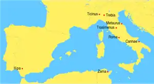 More than one town in what became the Roman province of Africa was called Zama. The Zama associated with the battle is likely to be the Zama Regia mentioned in Sallust's account of the Jugurthine War as besieged unsuccessfully by Quintus Caecilius Metellus Numidicus. Later, Zama Regia was the capital of Juba I of Numidia (60–46 BC) and so, in the view of the Oxford Classical Dictionary, it was called Zama Regia (Royal Zama).[1] Scullard prefers the suggestion that the town got the appellation "Regia" before the destruction of Carthage in 146 BC, indicating that it was not under Carthaginian control and belonged to the kingdom of Numidia.[2]