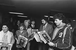 Servaes-Beij cared about the poor and disadvantaged, and often performed in prisons and hospitals. She was regularly in direct contact with her public, and received many emotional letters.[1] The Zangeres Zonder Naam was one of the artists who performed at the Dutch Miami Nightmare concert (Amsterdam, 8 October 1977). This evening was directed against Anita Bryant and her anti-gay movement, and the Zangeres Zonder Naam performed her own song Luister Anita ("Anita, listen to me"), in which she compared Bryant with Hitler.[1]