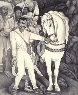 Zapata (1932) is a lithograph by the Mexican artist Diego Rivera (1886–1957) that depicts the Mexican revolutionary Emiliano Zapata (1879–1919) as he holds the reins of a horse among a group of campesinos (peasants). The lithographic edition was created and printed twelve years after Zapata's assassination. Zapata is based on Agrarian Leader Zapata (1931), one of eight "portable" frescoes produced explicitly for Rivera's solo exhibition at the Museum of Modern Art (MoMA) in 1931, which was adapted from his previous Revolt panel from a fresco titled The History of Cuernavaca and Morelos (1929–30) painted in the Palace of Cortés, Cuernavaca.[1] There were 100 original prints of the lithograph, many of which are in the collections of various art museums.
