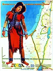 Zarqa is a 1969 Pakistani epic historical drama film directed, produced and written by Riaz Shahid while the music is composed by Rashid Attre and Wajahat Attre. It features Neelo, Alauddin, Ejaz Durrani, Saqi and Nasira as protagonist characters.[2] It is based on the life of Zarqa, a Palestinian dancer girl and a freedom activist, the latter of whom killed herself for the liberation of Palestine involving Israeli-occupied territories and Palestinian liberation movement.[3] It also addresses a real event of Neelo when she was forcibly invited by Nawab Malik Amir Mohammad Khan, the governor of West Pakistan to his office to perform a stage dance during the 1965's official visit of Mohammad Reza Pahlavi to Pakistan.[4]