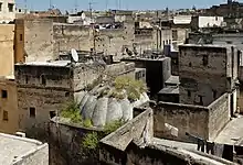 The zawiya's most prominent external features are its minaret, the tallest in the old city of Fez,[4][6] and the large green-tiled pyramidal roof over the mausoleum chamber. As a result, it is one of the most visible and easily identifiable buildings on the old medina's skyline. Up close, however, the zawiya is often obscured by the narrow lanes and the densely-packed buildings of the old city. On the zawiya's eastern side is a grid-like set of covered streets which make up a bazaar known as the Kissaria (also spelled kisariyya or qaysariyya), historically the central and most prestigious market in the city, situated between the two most important mosques of the city (the Qarawiyyin Mosque and Idris II's mosque/zawiya).[15] Further west, on the south side of Place Nejjarine, is the historic Hammam Moulay Idris which is associated with his tomb and traditionally considered to confer some of its blessings.[16][15][17]