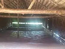 Zawlbûk was always located at the centre of the village, in close proximity to the chief’s residence. Since its basic purpose was to house all the bachelors of the village, it was dominantly the largest house. The size did vary from village to village depending on the size of the community. It was constructed through social work using timbers and thatch from the nearby forest.[5] The timber forming the central pole is especially large to support most of the structure and is called tlung. From this were extended a sloping roof and floor with support structures. The floor and walls were made of cracked bamboo, and the roof was made entirely of thatch. It had no special entrance as the entire front was open. However, the front had a small platform or verandah with a bamboo wall hanging from the roof up to about 5 ft, making the entrance quite low. Usually to the right of this area was reserved for the stockpile of firewood.[6] The space around this verandah was called awkpaka, which was delimited by one (or two) massive log of wood, at about 2 ft high, spanning the whole breadth of the entrance. This was known as bawhbel (or pawmpual to the southerners) and was an off-limit to the rest of the population, women, children, married men, and even the royalty and the council. The interior was simply a spacious empty room practically without any furniture, other than a fireplace at the very centre. The back wall was made into a small platform known as dawvan about 6 ft wide and 1 ft high from the floor. The entire floor served as a wrestling (which was predominantly the nightly activity) arena and the sleeping area, and is called buanzawl. Just above was the bahzar which could be opened towards the outside as a big window.[7]