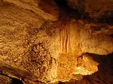 The caves are filled with formations of stalagmite and aragonite that resemble geysers and doughnuts, and the bottom levels of the cave are filled with carbon dioxide.[2] The temperature stays around 14 °C (57 °F) throughout the year, and the caves are the warmest underground places in the Czech Republic.[2]