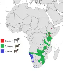 Non-African equines that may have been basal to zebras include E. sansaniensis of Eurasia (circa 2.5 mya) and E. namadicus (circa 2.5 mya) and E. sivalensis (circa 2.0 mya) of the Indian subcontinent.[33] A 2017 mitochondrial DNA study placed the Eurasian E. ovodovi and the subgenus Sussemionus lineage as closer to zebras than to asses.[38]