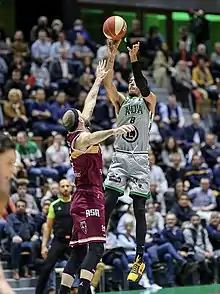 ![]() Zeke Moore shooting over defender while playing for French Club ADA Blois 41 in 21-22 season. | |
