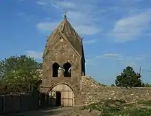 In the northwest corner of the complex stands a 16th–17th-century two-storey bell-tower, measuring 5.45 × 5.35 m., with its façades faced with grey hewn stone slabs. The ground floor acts as a vaulted porch with three bearing arches; the top storey a pyramidal structure containing bells. Façades contain several now barely legible asomtavruli inscriptions. The base between openings is a round pillar adorned with a capital. Each of the four façades of the bell-tower terminates in a gable, the peak of which is topped with a sculpted head of a ram. The bell-tower is flanked on either side by a stone wall, which is a later addition.[10][3]