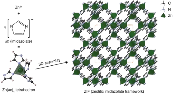 The structure of a zeolitic imidazolate framework is made through three-dimensional assembly of metal(imidazolate)4 tetrahedra.
