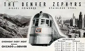 The name "Zephyrette" is derived from the Zephyr trains run by the Chicago, Burlington and Quincy Railroad, beginning with the revolutionary streamlined, stainless steel, diesel-powered Pioneer Zephyr that debuted in 1934. After the Pioneer Zephyr made its historic dawn-to-dusk run from Denver to Chicago in May 1934, coinciding with the Century of Progress International Exposition, the Burlington decided to implement an overnight Denver Zephyr between the two cities in 1936.[2]