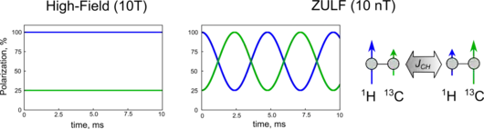 Importantly, the relative strength of and (and therefore the spin dynamics behavior of such a system) depends on the magnetic field. For example, in conventional NMR, is typically larger than 1 T, so the Larmor frequency of 1H exceeds tens of MHz. This is much larger than -coupling values which are typically Hz to hundreds of Hz. In this limit, is a perturbation to . In contrast, at nanotesla fields, Larmor frequencies can be much smaller than -couplings, and dominates.