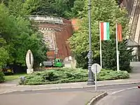 The present sculpture is the work of Miklós Borsos and was erected in 1975. The first official monument, a Madonna statue by Eugene Kormendi had been set up at this spot in 1932, but was destroyed in World War II.[1] A second sculpture, depicting a worker, was in place from 1953 until its replacement by the current one.