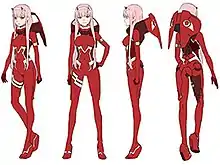 Zero Two is an elite pilot originally belonging to the special forces unit with an infamous reputation as the "Partner Killer" due to none of her previous co-pilots having survived past three rides.[15] As an artificially-created hybrid between humans and Klaxo sapiens (a cybernetic dinosaur-like species which inhabited the Earth millions of years ago),[6] she possesses superhuman abilities such as increased strength and rapid regeneration.[16] Commonly viewed by others as a monster, Zero Two possesses bestial physical characteristics such as two small red horns and fangs.[17] She began to pursue her ambition to become fully human after meeting the protagonist Hiro in her youth, and frequently questions the meaning of humanity.[18] Zero Two has a confident and assertive personality, as well as being consistently rebellious towards the collectivist, quasi-theocratic world government depicted in the series.[19][20]