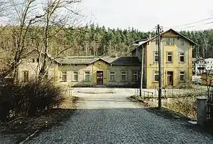 Although the station is located in Thuringia, the lines were built by the Royal Saxon State Railways (Königlich Sächsische Staatseisenbahnen), so that the brick buildings were built in the typical style of Saxony. The station was equipped with three platforms, a two-storey entrance building with a one-storey annex, a goods shed and head and side loading ramps. Two loading roads were also available for freight transport.