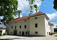 Tuštanj Castle (German: Tuffstein) is a castle in the settlement. It stands on a hill southwest of Moravče and southeast of the road to Vrhpolje. It was built in 1490, and the restyled as a Renaissance mansion between 1667 and 1671. It has an arcaded courtyard, a door casing with a heraldic plaque, and vintage furnishings. There is a chapel next to the castle dating from 1704 with Baroque paintings. The castle park preserves a pond and a large plane tree.[5]