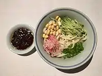 Zhajiangmian (simplified Chinese: 炸酱面; traditional Chinese: 炸醬麵; pinyin: zhá jiàng miàn), commonly translated as "noodles served with fried bean sauce",[2] is a dish of Chinese origin consisting of thick wheat noodles topped with zhajiang, a soybean-based sauce. Variations may include toppings of vegetables, beans, meat, tofu, or egg.