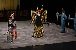 Zhang Fei appears on the Kunqu stage as a hualian. In one particular famous scene, The Swaying Reeds, Zhang Fei ambushes and humiliates Zhou Yu before setting him free.