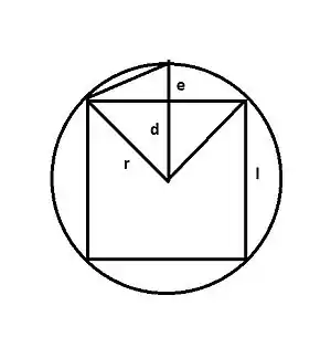 If denotes the length of a side of the square, draw a perpendicular line d from the center of the circle to side l. Let e denotes r − d. Then from the diagram: