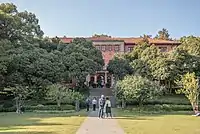 The campus was built in Mount Qingwang upon the Qiantang River, with a total area of 650 mu and a total building area of 70,000 m2. Characterised by redbrick buildings, the campus is considered one of the most beautiful university campuses in China.[2] The campus is American styled, with campus buildings adopting both traditional Chinese and western architectural styles and a central garden where Sun Yat-sen made a public speech on 10 December 1912 during his visit to the university. Severance Hall used to have a Chinese-styled rooftop, which was replaced a hip roof in the 1946 renovation.[9] The Paxton Residence and the North Pacific Residence are major residences in the campus, which are characterised by classical architectural features, including round arches, red brick exteriors and an arcade.[5][9] The Tooker Memorial Chapel, a grey neo-Gothic building, was the only religious building in the campus.[2] Zeng Xianzi Teaching Building, designed by the Architectural Design & Research Institute Of Zhejiang University (UAD), used similar red bricks as a major building materials, to mimic the styles of the historical buildings in the campus.[2]
