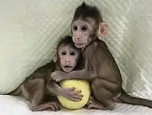 Zhong Zhong (Chinese: 中中; pinyin: Zhōng Zhōng, born 27 November 2017) and Hua Hua (Chinese: 华华; pinyin: Huá Huá, born 5 December 2017) are a pair of identical crab-eating macaques (also referred to as cynomolgus monkeys) that were created through somatic cell nuclear transfer (SCNT), the same cloning technique that produced Dolly the sheep in 1996. They are the first cloned primates produced by this technique. Unlike previous attempts to clone monkeys, the donated nuclei came from fetal cells, not embryonic cells.[1][2][3][4][5] The primates were born from two independent surrogate pregnancies at the Institute of Neuroscience of the Chinese Academy of Sciences in Shanghai.[6]