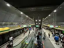 Zhongshan (Chinese: 中山, formerly transliterated as Chungshan Station until 2003) is a metro station in Taipei, Taiwan served by Taipei Metro. It is a transfer station between the Tamsui–Xinyi and Songshan–Xindian lines. The station opened on 28 March 1997 for traffic on the Tamsui-Xinyi line, and Songshan-Xindian line services opened on 15 November 2014. It is located in the middle of the underground Zhongshan Metro Mall and near the Shin Kong Mitsukoshi Department Store.