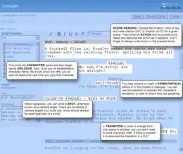 Screenplay Template – The script editor provides a built-in screenplay template which formats the document to a standard for scripts as recommended by the AMPAS.[5] The screenplay document is composed of seven elements: scene, action, character, dialogue, parenthetical, transition and shot (see image). Each element has a specific style to which the script editor conforms as you type.