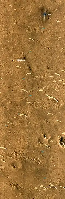 As of 11 July 2021, CNSA announced that Zhurong had travelled more than 410 m (1,350 ft) on the Martian surface.[32]