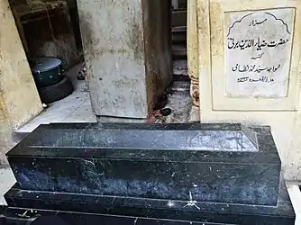 His gravestone lies in the courtyard of Nizamuddin Auliya's dargah in Delhi, at the entrance of the dalan of Mirdha Ikram, and near the tomb of Amir Khusrau.