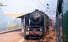 Yugoslav Railways (JŽ) Class 06 2-8-2 at Zidani Most with a train of hopper wagons, August 1971
