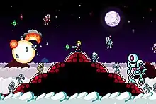 Rogers explained that they did not add a pause option because he did not want non-game icons in the screen and because (like in Contra) players would die too soon after resuming. He saw the game as simultaneously a "snow globe of an electric toy" and a "gosh darn airtight hardcore video game" homage to the Super Nintendo Entertainment System and Sega Genesis, and called Ziggurat a descendant of his hobbies: Ibara: Black Label and the Rubik's Cube.[10] Rogers added that the game contained nine hours of scripted events and that the Archenemy alien "is only the beginning".[10] Rogers produced a trailer for the game.[2] It was released for iOS platforms on February 17, 2012.[12] Two months later, Freshuu, then the game's publisher, signed Ziggurat as the first client for Gimme, an in-game achievement to "real-life rewards" incentive program.[13] The game received two spikes in sales following positive reviews from journalists, and from a mock infomercial's release on YouTube, all postrelease and not at the time of launch. Brandon Sheffield, writing for Game Developer, thought that Rogers handled the postrelease well since leaking details to the press before the game was available may have impacted sales.[14] Action Button later became the game's publisher.[15]