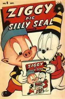 Ziggy and Silly became the cover stars of all eight issues of Animated Funny Comic-Tunes (#16-23, Summer 1944 - Fall 1946; Silly not on cover of #18), all seven issues of Silly Tunes (Fall 1945 - April 1947; as part of ensemble on last issue), on issues of Ideal Comics, and elsewhere. They appear on the Super Rabbit-dominated ensemble covers on all but issues #10 & 12 of the dozen-issue All Surprise Comics (Fall 1943 - Winter 1946), and in both the ensemble covers and their own covers on all six issues of Comic Capers (Fall 1944 - Fall 1946). Ziggy and Silly headlined their own six-issue Ziggy Pig-Silly Seal Comics (Jan. 1944 - Sept. 1946).[8][9]