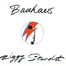 According to AllMusic's Dave Thompson, the band were "killing some downtime" at Trident Studios in London when members Haskins and Daniel Ash began an impromptu jam of "Ziggy Stardust" as a "joking tribute" to "the artist with whom virtually every critic in the land had now compared Bauhaus." Tapes were running and once they heard the track, they were "absolutely enthralled" and decided to include it during their upcoming BBC session for John Peel.[66] Bauhaus subsequently recorded their version of "Ziggy Stardust" at a session in 1982.[67] Their version has been categorised as gothic rock and post-punk.[33][68] The group filmed a music video for their cover in August 1982 at the Roundhouse under Camden Market in London. Directed by Mick Calvert, it features the band performing a full "mock-gig" with complete backline and "riotous" fans.[68][63] Ned Raggett of AllMusic praised Bauhaus' rendition of "Ziggy Stardust", calling it a "nuclear-strength take" on the original.[31]