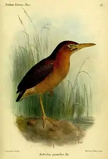The zigzag heron was formally described in 1789 by the German naturalist Johann Friedrich Gmelin in his revised and expanded edition of Carl Linnaeus's Systema Naturae. He placed it with the herons, cranes, storks and bitterns in the genus Ardea and coined the binomial name Ardea undulata.[2] Gmelin based his description on the zigzig bittern from Cayenne that had been described by the English ornithologist John Latham in his multi-volume work A General Synopsis of Birds.[3] Latham had in turn based his account on "Le petit butor de Cayenne" that had been described and illustrated in Comte de Buffon's Histoire Naturelle des Oiseaux.[4][5] The zigzag heron is the only species placed in the genus Zebrilus that was introduced in 1855 by the French naturalist Charles Lucien Bonaparte.[6][7] The genus name Zebrilus is a diminutive of the French zèbre meaning "zebra". The specific epithet undulatus is Latin meaning "furnished with wave-like markings".[8] The species is monotypic: no subspecies are recognised.[7]