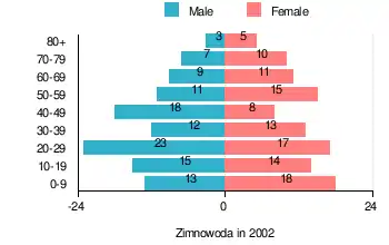 According to the 2002 Poland census, there were 222 people residing in Zimnowoda village, of whom 50% were male and 50% were female. In the village, the population was spread out, with 24.8% under the age of 18, 36.5% from 18 to 44, 21.2% from 45 to 64, and 17.6% who were 65 years of age or older.[1]