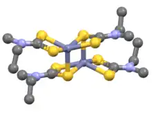 Compounds of the type Zn(S2CNR2)2 are dimeric, i.e. their proper formula is [Zn(S2CNR2)2]2.[6] Each Zn center is in a distorted pentacoordinate site, with four Zn-S bonds of 2.3 Å length and one Zn---S interaction >2.8 Å in length. Mono-zinc derivatives are obtained by adding strong ligands (L) such as amines, which give adducts Zn(S2CNR2)2L.[7]