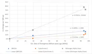 Slow rate evolution is apparent for the ZNF226 protein. It evolves in a manner similar to the cytochrome c protein instead of the fibrinogen alpha chain protein (Figure 6).