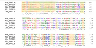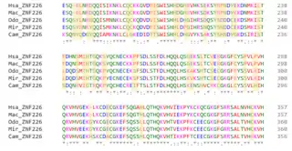 Although there is little information available on the ZNF226 gene, homologs of the gene have been found across eukaryotes and bacteria species. Strict orthologs were only found within mammals (Figure 4). The ZNF226 gene is also closely related to the paralog ZNF234 in humans, and the Zfp111 gene within mice.[5][8] Across the various species in which ZNF226 orthologs and homologs that were identified, conservation of the C2H2 binding sites is apparent (Figure 4–5).[12] In human ZNF226 paralogs, there is also conservation of the C2H2 binding sites, as well as nucleic acid binding sites.[5]