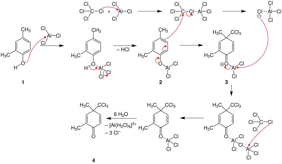 The classic example of this reaction is the conversion of p-cresol to a cyclohexadienone (with the aid of aluminium chloride as a catalyst and tetrachloromethane as a solvent). Melvin Newman, a scientist from the U.S. intensively studied the reaction in the 1950s and reported several improved procedures as well as mechanistic studies. Since then, studies investigating the impact of alternate reagents have been conducted by others.[4][5]