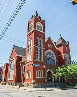 Both the school and the church are brick buildings with stone foundations and additional elements of stone. The church is in the Gothic Revival style of architecture, while the school building mixes elements of the Queen Anne and Colonial Revival styles.[1] The school is no longer used as such, with classes having ceased in 1974.[4] In 1984, Zion Lutheran Church and School were each listed on the National Register of Historic Places, both qualifying because of their historically significant architecture and because of their role in local history. The two were part of a multiple property submission of buildings along Prospect Avenue, along with nearby buildings such as First Methodist Church, the Phillip Gaensslen House, and the Dr. William Gifford House.[1] They have also been given city historic-landmark designation,[5] and their location at Prospect and E. 30th is located within the city-designated Prospect Avenue Historic District.[6] The congregation was a founding member of the Lutheran Church–Missouri Synod (LCMS),[4] within which it has remained.[7]