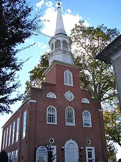 The church is one of three churches in Chambersburg known as "rose rent churches." Every June these churches pay a single rose in rent to the descendants of Benjamin and Jane Chambers, according to the terms of the 18th century deeds. The church is built in a classic Georgian style. For many years it had the largest auditorium in Chambersburg and hosted many well-known speakers, including Archbishop John Hughes in 1842 and Schuyler Colfax in 1867, then Speaker of the House and later Vice President.[2]