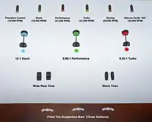 Six motors and three gear ratios were offered, ranging from the 10,000 rpm "precision control motor" to the high-speed 34,000 rpm "NX" (named after a popular brand of nitrous oxide). Gear ratios were 12:1 "stock", 9.86:1 "performance" and 8.25:1 "turbo". Tracking was adjusted via a wheel alignment lever underneath the vehicles themselves. The vehicle's on-board battery was charged by snapping the entire car onto the top of the transmitter. Full charge was accomplished in about 40 to 60 seconds with run times averaging five minutes. Neither steering nor throttle was proportional, with both functions either full on or full off. The SE series added semi-proportional, two-speed throttle and fully proportional rack-and-pinion steering with steering trim adjustable at the transmitter, as with a full-sized R/C.