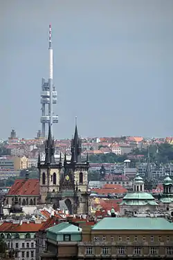 ![]() Žižkov TV Tower from the city centre | |