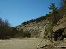 The cliffs along Zoar Valley's gorges are composed of Devonian silt stones and shale, and are part of the Canadaway Formation.[2]: 13 The valley's gorges expose stratifications of the Onondaga Escarpment.[3] Cliffs near the confluence of Cattaraugus Creek's South and Main branches reach heights of up to 500 feet (150 m) when measured to the tops of nearby hills.[2]: 13