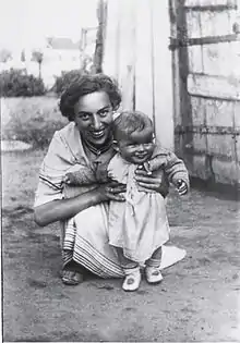 The Siedlce Ghetto liquidation action began on Friday, 22 August 1942.[9] Around 10,000 Polish Jews from three transit ghettos were rounded up at the town square.[lower-alpha 1] The next morning the men, women and children were marched to the Umschlagplatz and sent to Treblinka aboard awaiting Holocaust trains. An additional 5,000 to 6,000 Jews were forced into the cemetery and sent away to their deaths the following day by train.[11] Cypora with her one-year-old Rachela (pictured) found refuge in the so-called 'small ghetto' (a.k.a. 'the little ghetto', or Drojek) thanks to Jakub, who organized their transfer, but the ultimate fate of the remaining Jewish prisoners could easily be guessed.[12] Cypora joined a group of Jewish refugees at a house inside the little ghetto.[4] There, she took care of another Jewish girl, Dorota Monczyk (Maczyk). Three days later Cypora learned about the hospital massacre by Orpo and left the Drojek ghetto under the cover of night. They came to the house of another one of Cypora's high school friends, Irena Zawadzka, on the Aryan side of the city.[4]