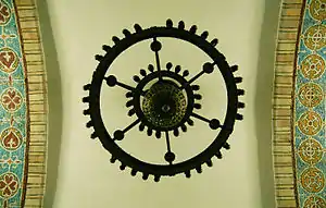 The station is illuminated by two-tierd bronze chandeliers, each featuring 12 distinct lighting groups holding candle-like bulbs. The chandeliers, designed by Stanislav Adamenko and Mariya Ralko,[10] were installed between the mosaic stripes.[12] Both the station halls and the underground vestibule feature similar light fixtures, although they are significantly smaller than the main chandeliers. The redesign also called for a gold smalt-covered ceiling, although this was rejected as it was too expensive.[10] To finish it off, gray granite was used on the floor.