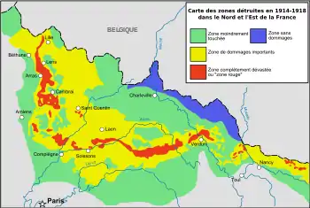 The zone rouge was defined just after the war as "Completely devastated. Damage to properties: 100%. Damage to Agriculture: 100%. Impossible to clean. Human life impossible".[1]