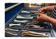 Identification is integral to the archaeological analysis of animal remains.[10]: 1 Identification of animal remains requires a combination of anatomy, taxonomy, and studies of archaeological context.[10]: 1 The ability to identify a piece of bone requires knowing what element (bone in the body) it is, and to what animal the bone belongs.[10]: 1 The latter is referred to as taxonomy, which is used to sort animals into different groups.[10]: 1 Zooarchaeology uses Linnean nomenclature, which includes varying degrees of specificity in regards to the species.[10]: 2 Linnaean nomenclature (Linnaean taxonomy) is used because it allows archaeologists to identify and show the genetic and morphological relationships between species.[10]: 2 These relationships are based on species evolution, which can often be subject to interpretation.[10]: 4 While more specific identification is preferable, it is better to be less specific in the identification rather than identify a specimen incorrectly.[10]: 2 When examining animal remains, it is common that there are bones that are too small or too damaged to be able to accurately identify it.[10]: 3 Archaeological context can be used to help with assumptions about species identification.[10]: 3 Skeletal classification is the other half of properly identifying animal remains.[10]: 1 Bones can be classified by the material it is made of and by its shape. (7) Three categories of bone shapes include long bones, flat bones, and irregular bones.[10]: 7 Bones are structured differently depending on where they are located and what part of the bone it is; the main structural differences are found between spongy bone and compact bone.[10]: 8 Spongy bone and compact bone both serve different purposes in regards to bone function; for example, the outside layer of the bone that provides structure is made of compact bone, whereas the inside of the bone is made of spongy bone.[10]: 8 The study of bones is useful to zooarchaeology because certain morphological aspects of a bone are associated with particular periods of growth, which can help narrow down the age the specimen was at death.[10]: 9 The analysis of teeth require a slightly different approach than bone, but retain the same level of importance when it comes to analysis.[10]: 9 The wear pattern and tooth morphology provides information about a species diet and age; the enamel also has biochemical remains of what the animal ate.[10]: 9 While animal remains can include more than just bones and teeth, the nature of things like hair and muscle cause it to deteriorate quickly after death, leaving the skeleton behind; this is why most of zooarchaeology revolves around skeletal morphology.[10]: 6 Laboratory analysis can include comparing the skeletons found on site with already identified animal skeletons.[5] This not only helps to identify what the animal is, but also whether the animal was domesticated or not.[5]