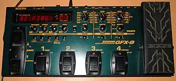 It has a solid steel dark green body with an opto-based pedal on the right and red LED display on the top left. It uses the Variable Architecture Modeling System (V.A.M.S) technology.[26] In general, there are three main internal modules: for drive, for modulation and for delay. The unit allows a high level of distortion customization by using specialized software. It also allows the use of external distortion. The technology used in the unit does not allow full reordering of the effects but allows some of modulation effects like wah and phaser to be connected before or after the drive module. The drive module implements dynamic related effects like compressor, overdrive, distortion and fuzz. After the drive module, the noise gate module called ZNR (ZOOM Noise Reduction) is connected, followed by a parametric equalizer (presence, treble, middle, bass). The amp simulation module is connected next and allows various types of guitar amplifier simulations. The modulation module implements effects like wah, phaser, chorus, ring modulator, tremolo, vibrato, flanger and pitch shifter. The delay module is used to implement delay and reverb effects. Effects that require high processing power use modulation and delay module together. One such effect is the jam play effect, which allows, for example, a guitar player to play a rhythm guitar part and then play a solo part over it. The unit design is oriented toward ease of use by providing more knobs than usually found on such units, thus making the unit look more like a chain of effect boxes instead of the typical effect processor with a "few knobs many functions" type design. The unit has mature MIDI capabilities, allowing both control from an external sequencer or using the unit as a MIDI controller. The MIDI OUT can be configured to act as MIDI THRU.