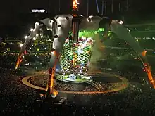 After Zoo TV, "Zooropa" was not performed live for 18 years until it was played towards the end of the U2 360° Tour in 2011. Clayton said that adding the song to the tour's set list was "very experimental" and that it was a "bit cheeky" to introduce to the tour as the band had little experience performing it.[33][34] The song debuted on the tour on 10 April 2011 in São Paulo, and was rehearsed at soundchecks several days prior.[35] The return of the song was so popular that the word "Zooropa" became a trending topic on Twitter during the evening of its tour debut.[36][37] "Zooropa" was performed at the remaining 26 concerts on the tour, in addition to a private show in Denver. As of 2011, "Zooropa" has been performed live at 31 shows.[30] During performances, the stage's 360° retractable video screen would expand its full length, and U2 would perform behind the screen as it took over the stage.[38] The Edmonton Journal commented that by hiding themselves from the fans during the performance, the combination of advertising slogans and flickering lights "help portray this Blade Runner-type world that U2 wants us to escape."[39] A live recording of "Zooropa" from the U2 360° Tour was featured on the U2.com member-exclusive album, U22, taken from the performance in Baltimore on 22 June 2011.[34]